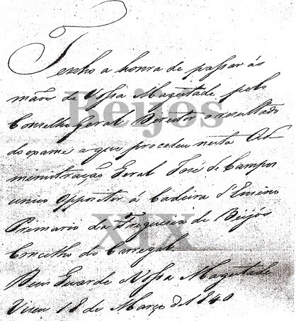 «Tenho a honra de passar às mão de Vossa Magestade pelo Conselho Geral Director o resultado do exame a que procedeu nesta Administração Geral José de Campos unico oppositor á Cadeira d'Ensino Primario da Freguesia de Beijós Concelho do Carregal.